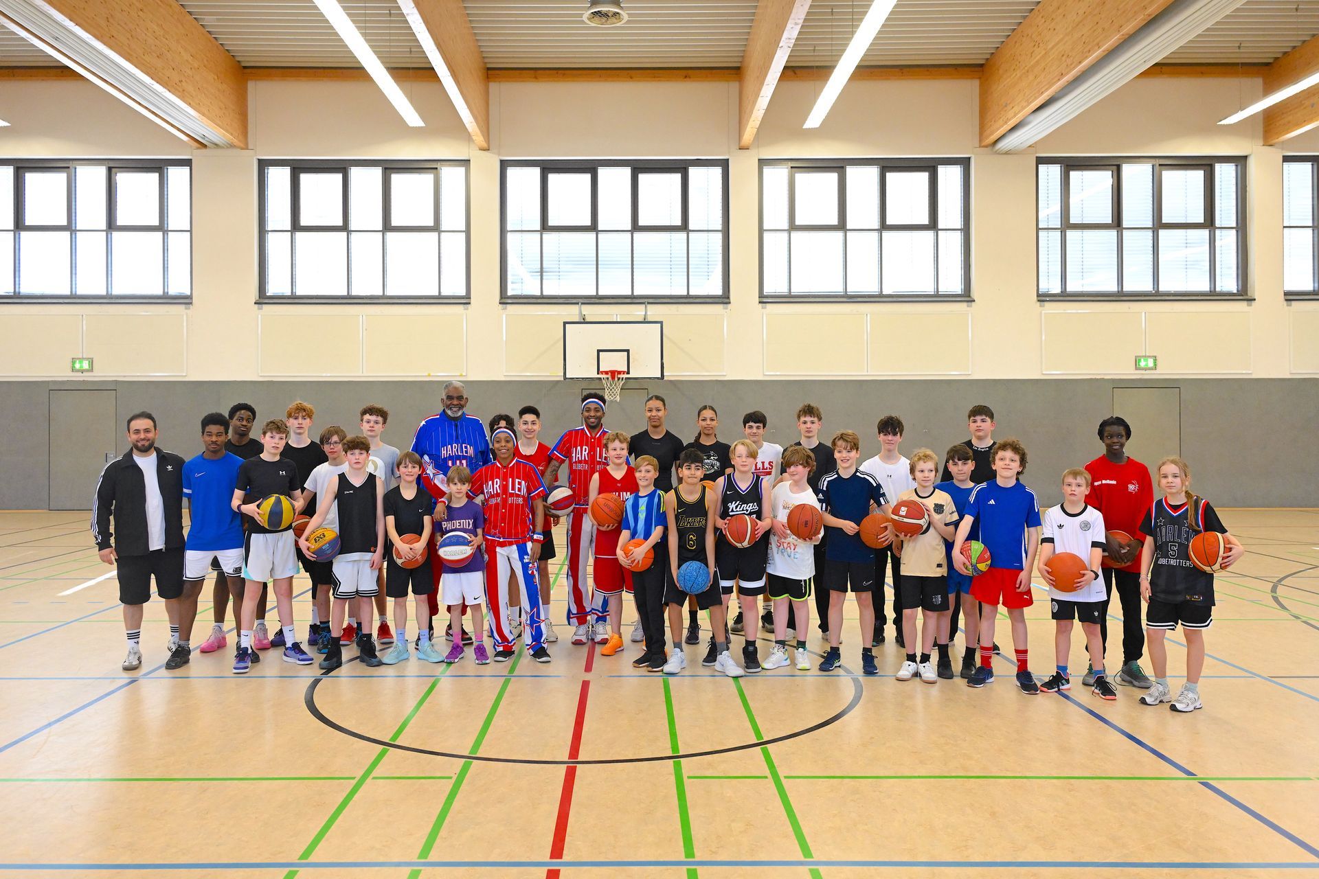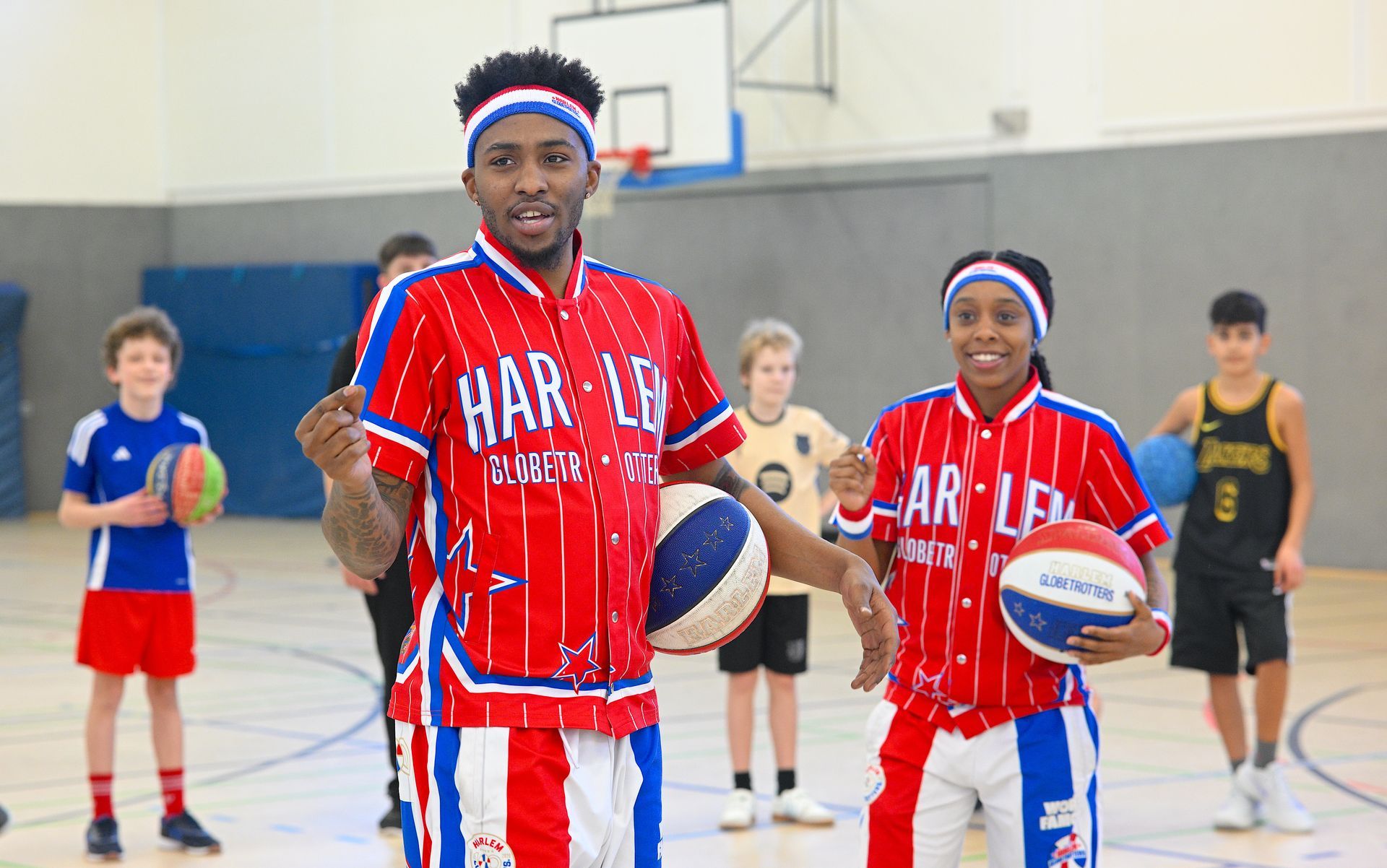 In diesem Jahr kamen von den Harlem Globetrotters "Sky" Zavian Jackson und Eryka "Spice" Sidnay nach Hannover, um mit Schülerinnen und Schülern der IGS zu trainieren. Im Rahmen des 100. Geburtstags-Besuchs zeigten die Baskettballprofis Tricks, Spielzüge und Finten. Und ein ganz besonderer Gast ist auf der Promotionstour mit dabei: der ehemalige Spieler und Trainerlegende "Sweet" Lou Dunbar.