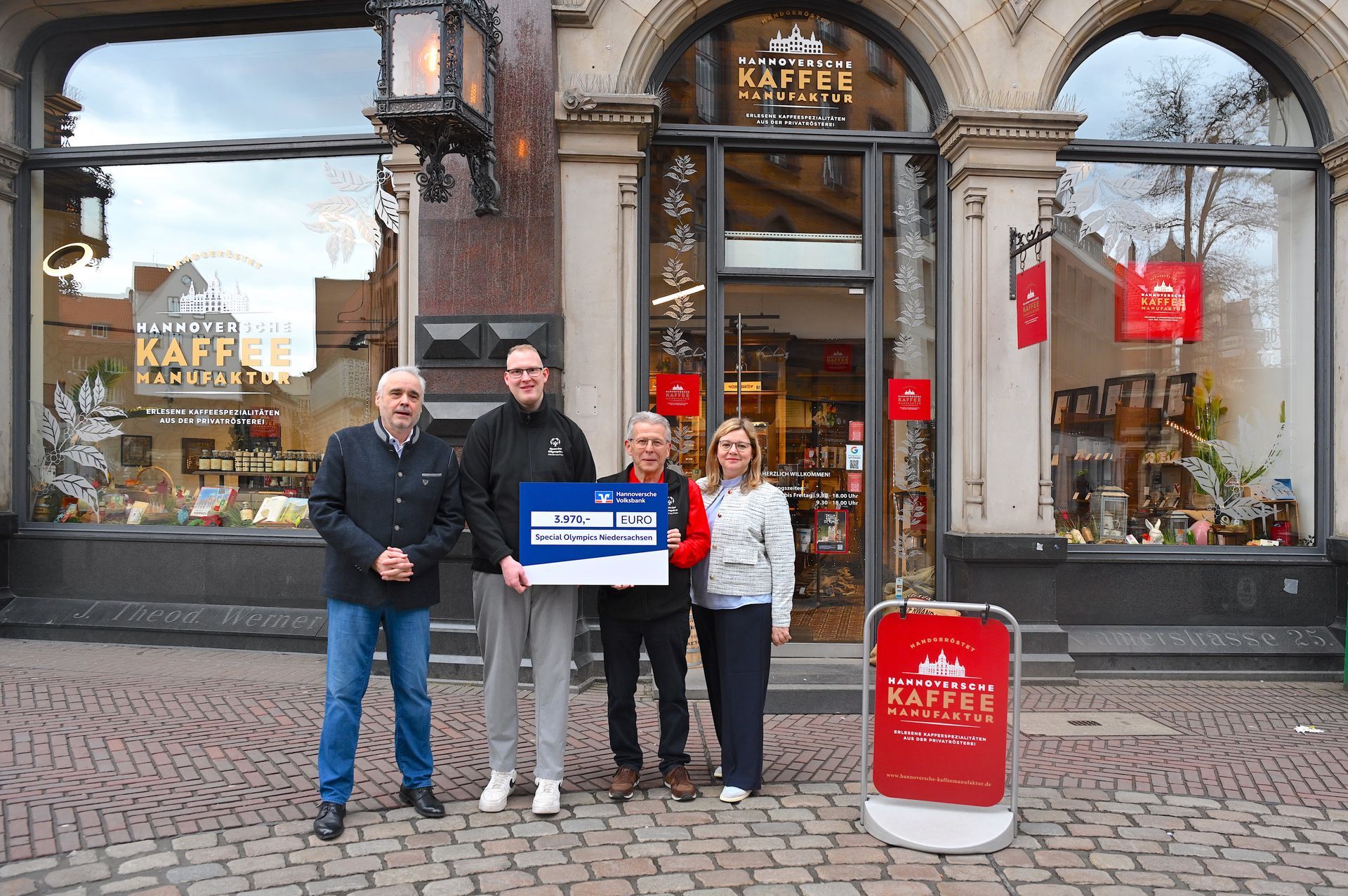 Für die Jahre 2024 und 2025 konnten Andreas Berndt, Geschäftsführer der Hannoverschen Kaffeemanufaktur und Anne Mahler, stellvertretendes Vorstandsmitglied der Hannoverschen Volksbank eine Summe über 3.970 Euro an Uwe Lübking, Vize-Präsident von Special Olympics Niedersachsen und Athletensprecher Kevin Struß überreichen.